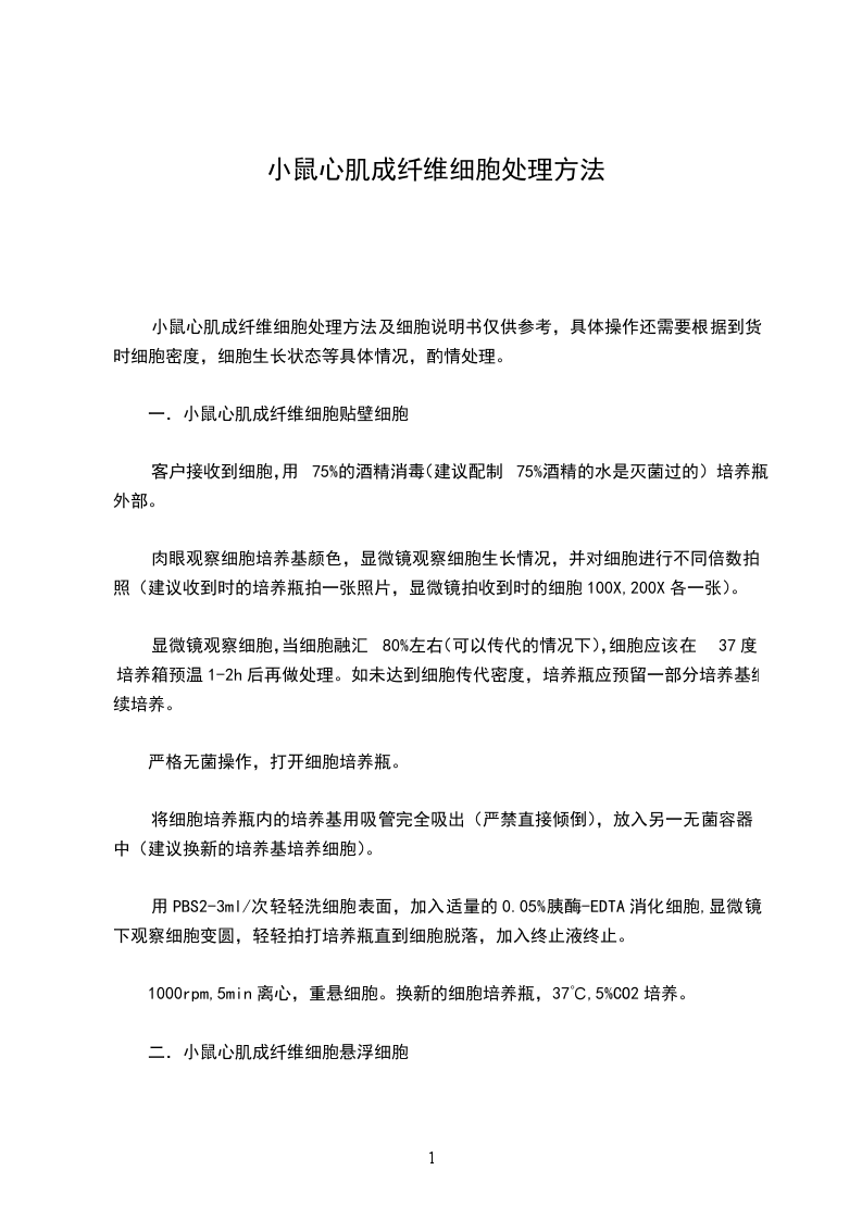 小鼠心肌成纤维细胞处理方法及细胞说明书仅供参考,具体操作还需要根据到货时细胞密度,细胞生长状态等具体情况,酌情处理。