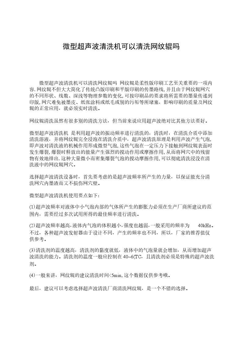 微型超声波清洗机可以清洗网纹辊吗 网纹辊是柔性版印刷工艺至关重要的一项内容.网纹辊不但大大简化了传统凸版印刷和平版印刷的传墨路线,并且由于网纹辊网穴的不同形状、线数、深浅等物理参数的变化,可按印刷品的要求将所需要的墨量传递到印版,网穴难免被墨皮、纸张涂料或纸毛或别的污垢等所堵塞,影响印刷的质量及网纹辊的正常应用,就必须实时清洗。