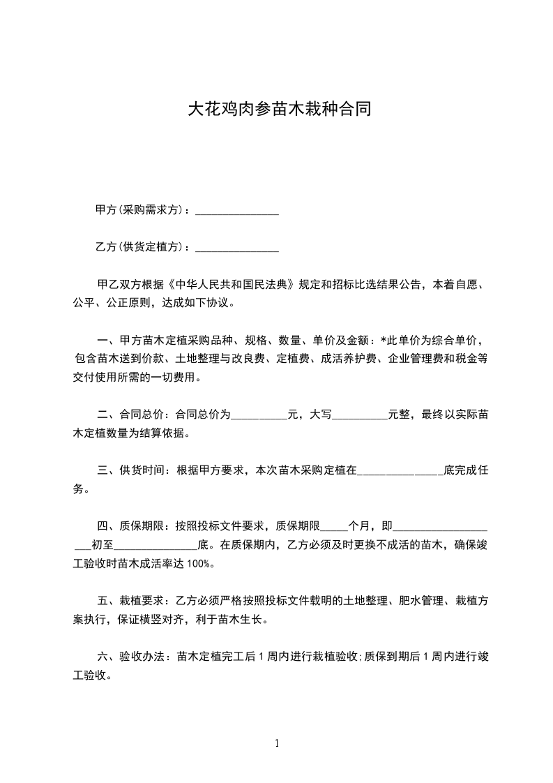 根据《中华人民共和国民法典》和国家或地方相关法律、法规及规范要求,经甲乙双方协商,就乙方按甲方要求提供甲方________________苗木事宜达成一致。为明确双方权利与义务,特签订如下协议条款,供双方共同遵守。