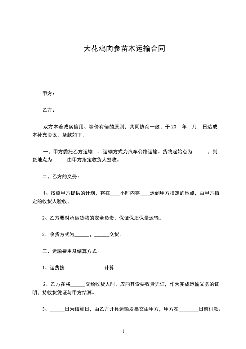 1、运输:由乙方将苗木送至甲方指定工地并承担运费,甲方负责下车及费用;