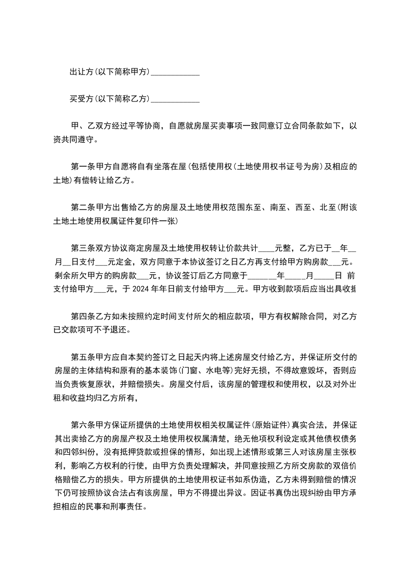 第三条双方协议商定房屋及土地使用权转让价款共计____元整,乙方已于__年__月__日支付___元定金,双方同意于本协议签订之日乙方再支付给甲方购房款___元。剩余所欠甲方的购房款___元,协议签订后乙方同意于_______年_____月_____日 前支付给甲方___元,于2024年年日前支付给甲方___元。甲方收到款项后应当出具收据。