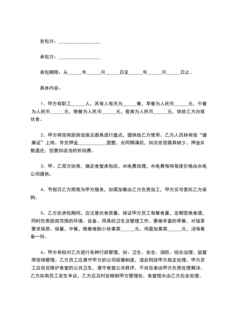 4、乙方在签订合同时应向甲方上交押金人民币1000元整。若乙方在合同期内无违反本合同规定,甲方在合同期满后应将押金如数退还乙方;承包期内食堂内的甲方资产由乙方负责管理使用,维修、年检一切费用由乙方自己承担。乙方应于开业前取得卫生部门颁发的卫生许可证,从业人员个人健康证,特种设备操作资格证,坚持持证上岗的原则。