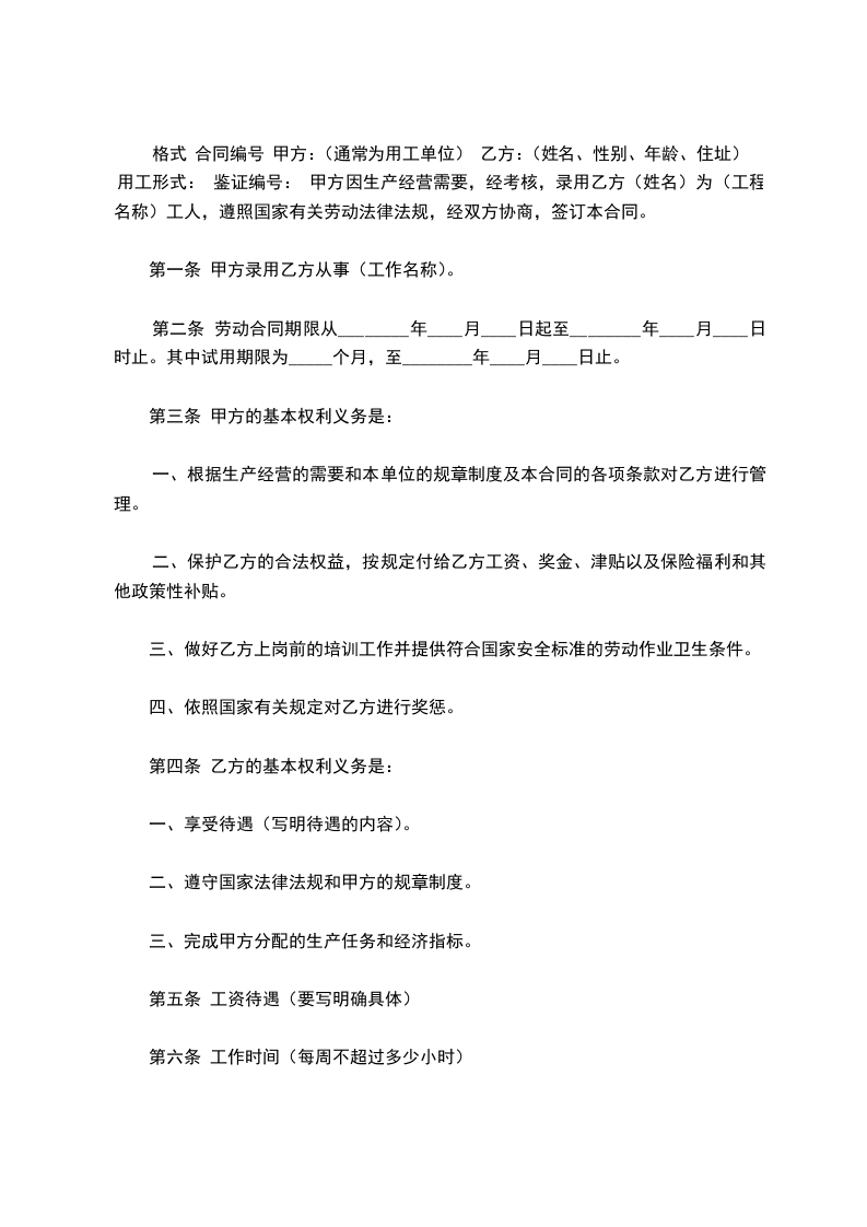 格式 合同编号 甲方:(通常为用工单位) 乙方:(姓名、性别、年龄、住址) 用工形式: 鉴证编号: 甲方因生产经营需要,经考核,录用乙方(姓名)为(工程名称)工人,遵照国家有关劳动法律法规,经双方协商,签订本合同。