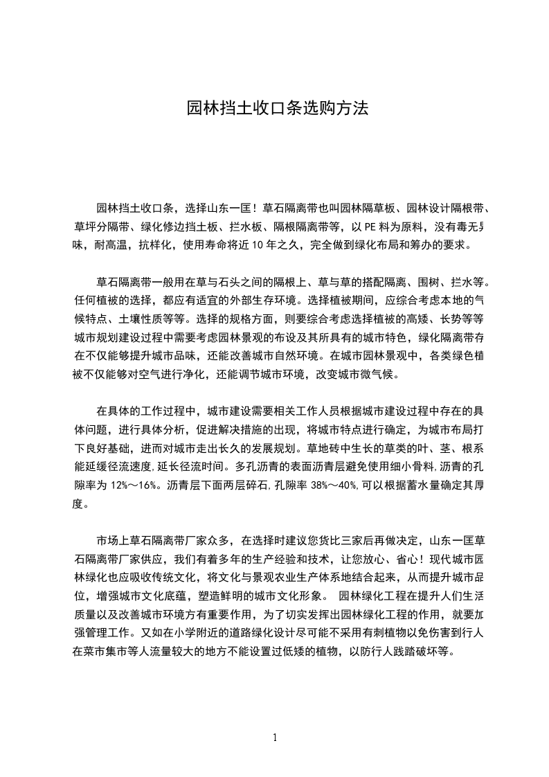 园林挡土收口条,选择山东一匡!草石隔离带也叫园林隔草板、园林设计隔根带、草坪分隔带、绿化修边挡土板、拦水板、隔根隔离带等,以PE料为原料,没有毒无异味,耐高温,抗样化,使用寿命将近10年之久,完全做到绿化布局和筹办的要求。