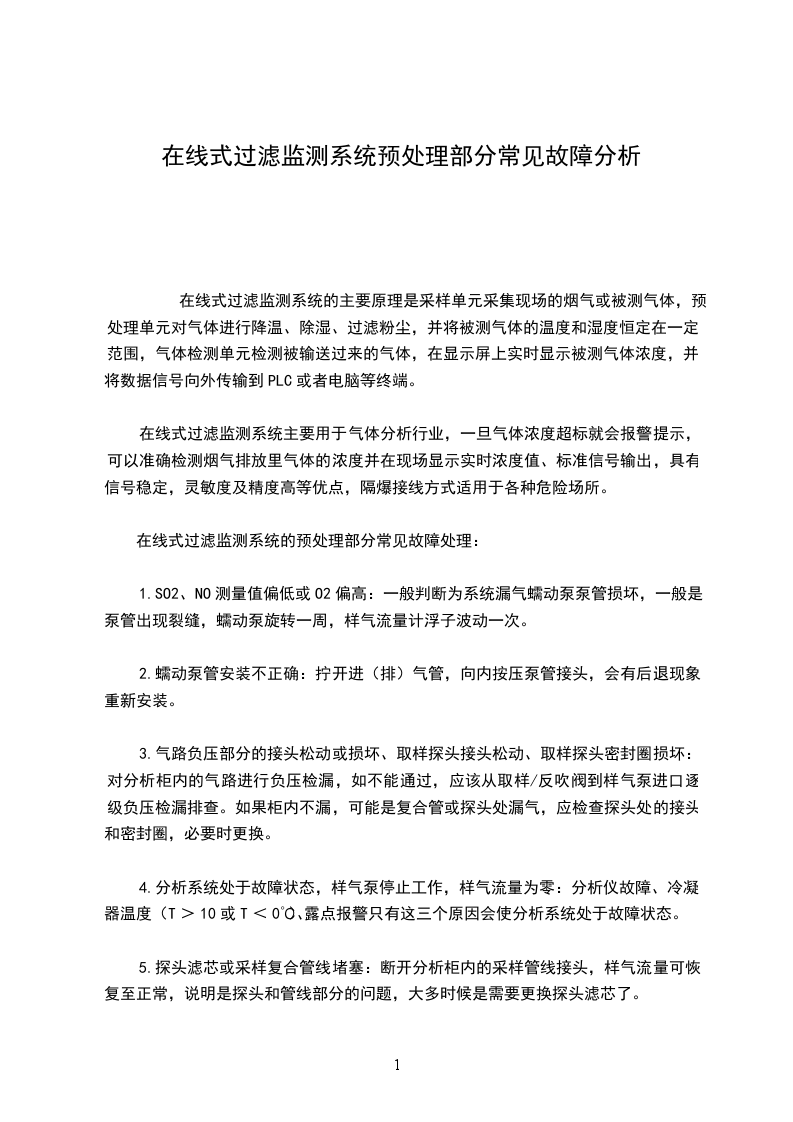 在线式过滤监测系统的预处理部分常见故障处理: