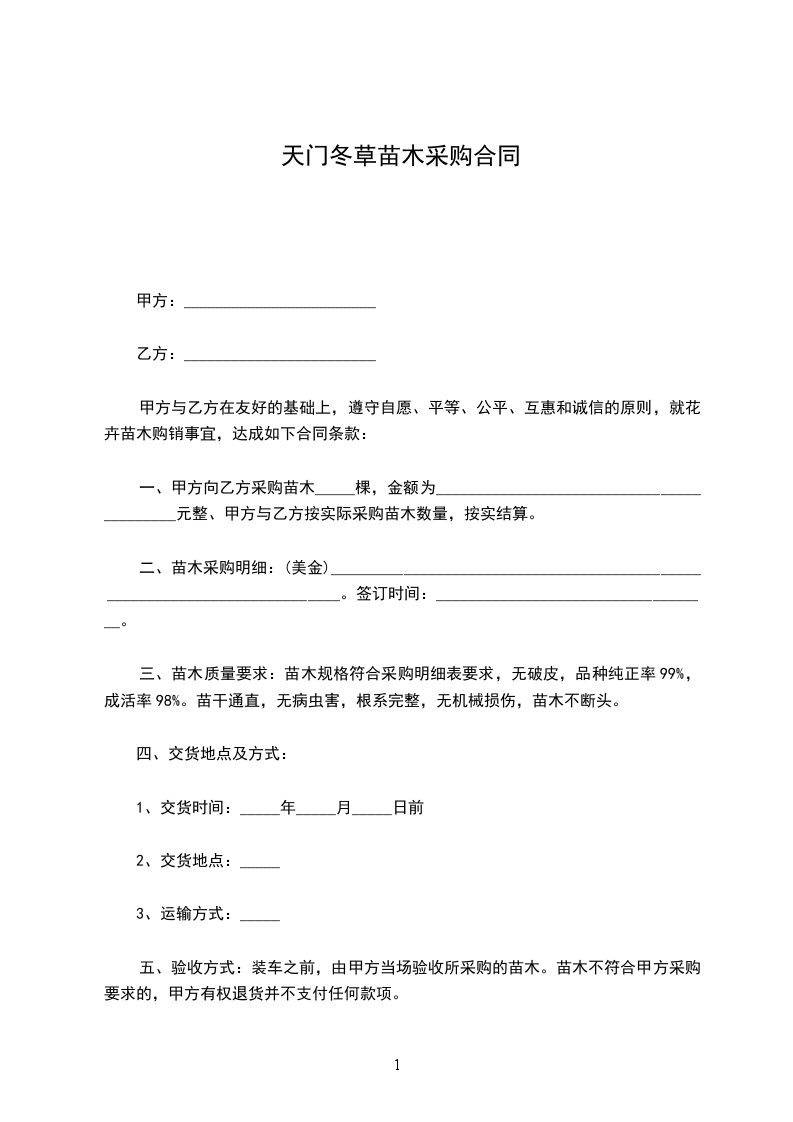 一、甲方向乙方采购苗木_____棵,金额为__________________________________________元整、甲方与乙方按实际采购苗木数量,按实结算。