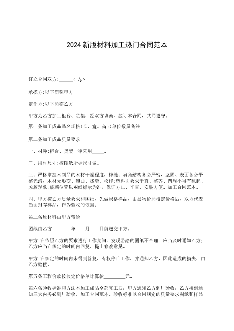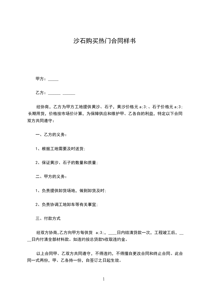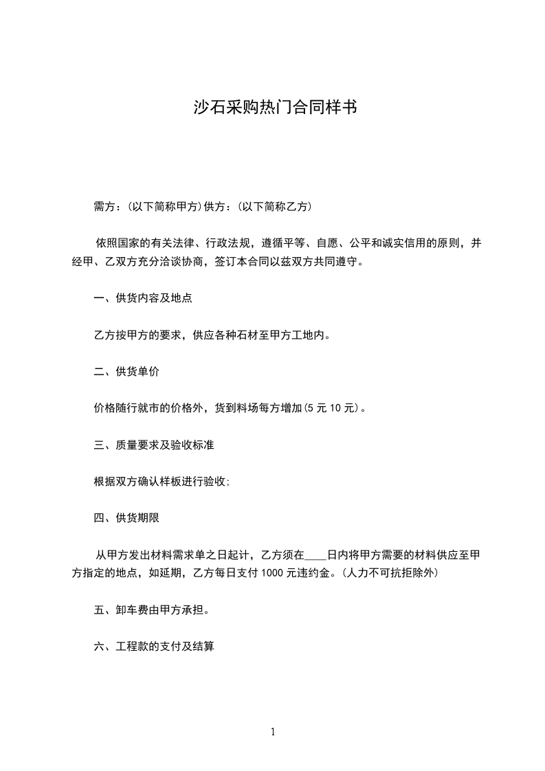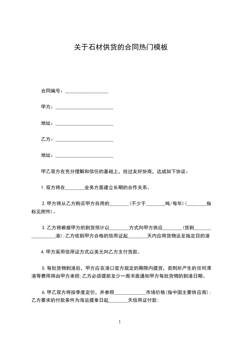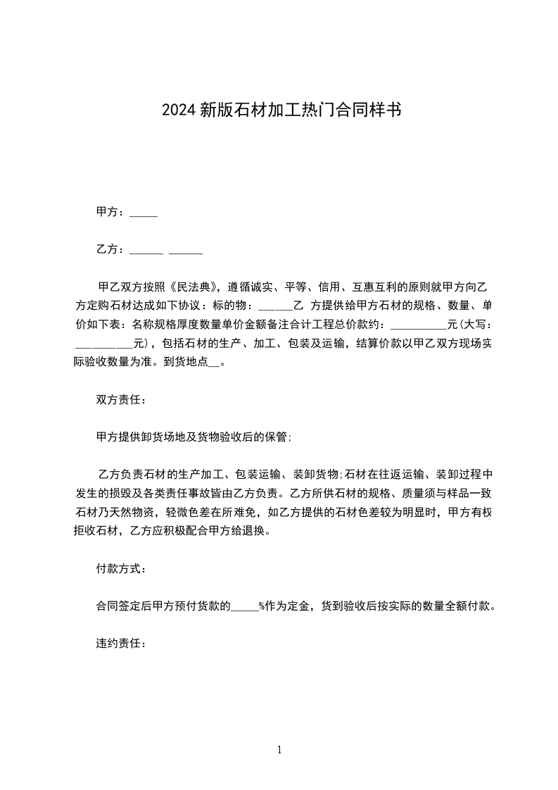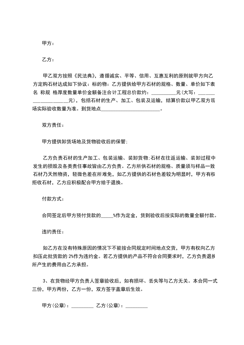 甲乙双方按照《民法典》,遵循诚实、平等、信用、互惠互利的原则就甲方向乙方定购石材达成如下协议:标的物:乙方提供给甲方石材的规格、数量、单价如下表:名 称规 格厚度数量单价金额备注合计工程总价款约:__________元(大写:_____________________元),包括石材的生产、加工、包装及运输,结算价款以甲乙双方现场实际验收数量为准。到货地点________________________。