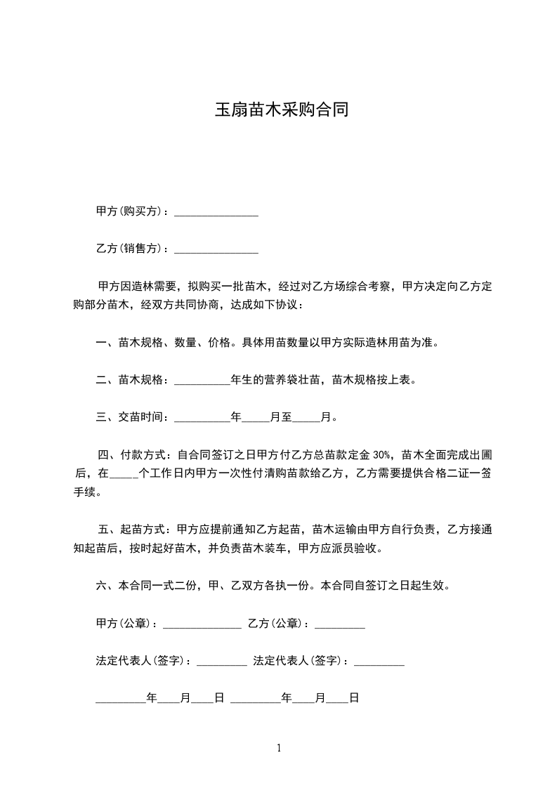 四、付款方式:自合同签订之日甲方付乙方总苗款定金30%,苗木全面完成出圃后,在_____个工作日内甲方一次性付清购苗款给乙方,乙方需要提供合格二证一签手续。
