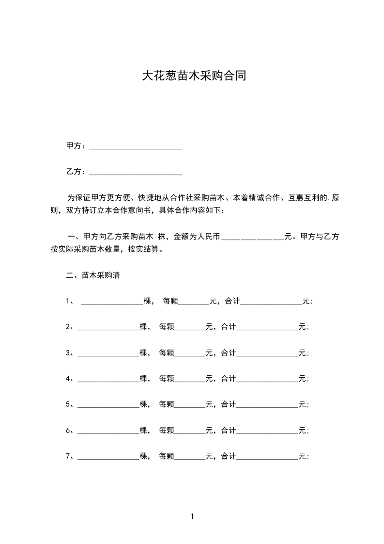 一、甲方向乙方采购苗木 株,金额为人民币________________元。甲方与乙方按实际采购苗木数量,按实结算。