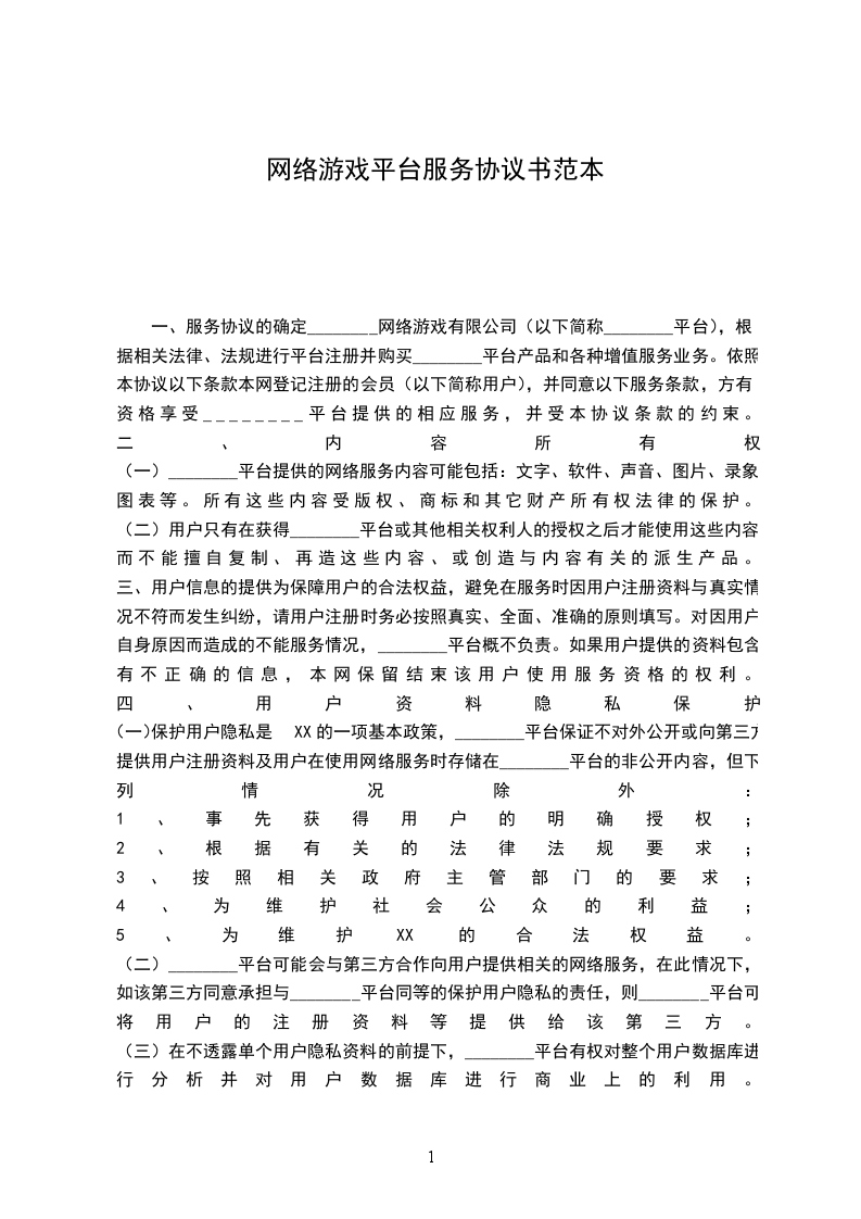 一、服务协议的确定________网络游戏有限公司(以下简称________平台),根据相关法律、法规进行平台注册并购买________平台产品和各种增值服务业务。依照本协议以下条款本网登记注册的会员(以下简称用户),并同意以下服务条款,方有资格享受________平台提供的相应服务,并受本协议条款的约束。