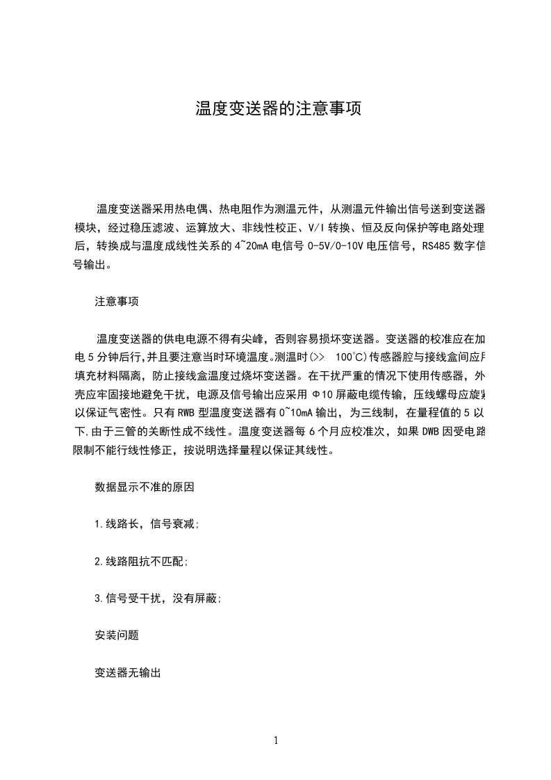 温度变送器的供电电源不得有尖峰,否则容易损坏变送器。变送器的校准应在加电5分钟后行,并且要注意当时环境温度。测温时(>>100℃)传感器腔与接线盒间应用填充材料隔离,防止接线盒温度过烧坏变送器。在干扰严重的情况下使用传感器,外壳应牢固接地避免干扰,电源及信号输出应采用Ф10屏蔽电缆传输,压线螺母应旋紧以保证气密性。只有RWB型温度变送器有0~10mA输出,为三线制,在量程值的5以下,由于三管的关断性成不线性。温度变送器每6个月应校准次,如果DWB因受电路限制不能行线性修正,按说明选择量程以保证其线性。