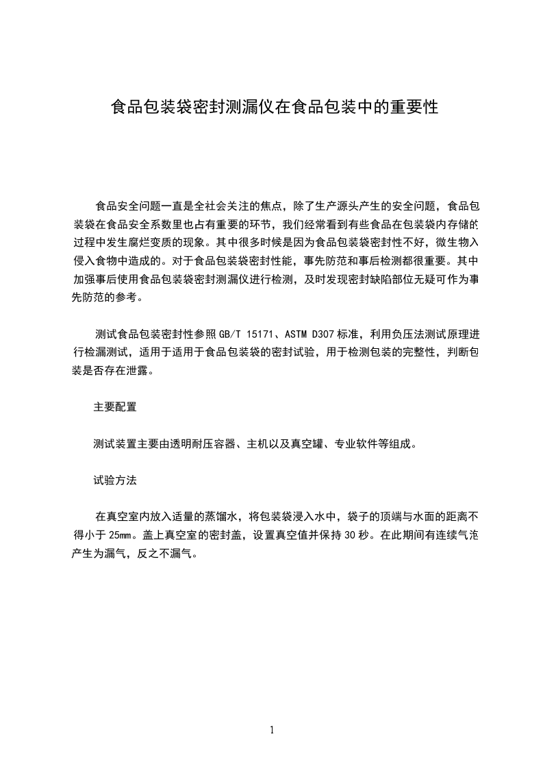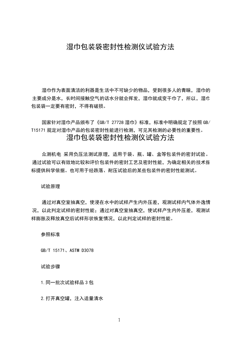 根据GB/T15171——1994《软包装件密封性能试验方法》:在水的作用下,外层材料的性能在期间是否会发生变化,如外层采用塑料薄膜的包装外,可以通过对真空室抽真空,使浸在水中的试样产生内外压差,以观测试样内气体外逸或水向内渗入的情况,以此测定试样的密封性能。