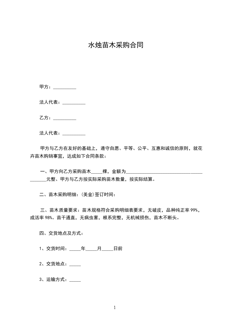 一、甲方向乙方采购苗木_____棵,金额为________________________________________元整、甲方与乙方按实际采购苗木数量,按实际结算。