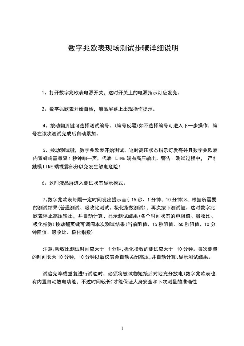 7、数字兆欧表每隔一定时间发出提示音(15秒、1分钟、10分钟)8、根据所需要的测试结果(普通测试、吸收比测试、极化指数测试),再次按下测试键。这时数字兆欧表停止高压输出,并自动计算、显示测试结果(各个时间状态的电阻值、吸收比、极化指数)按动翻页键可调阅本次测试结果(当前阻值、15秒阻值、60秒阻值、10分钟阻值、吸收比、极化指数)
