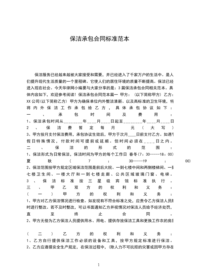 1、保洁承包时间从________年月____日起至________年月____日止。