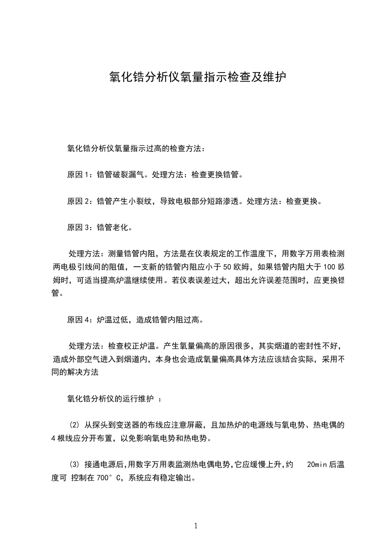 处理方法:测量锆管内阻,方法是在仪表规定的工作温度下,用数字万用表检测两电极引线间的阻值,一支新的锆管内阻应小于50欧姆,如果锆管内阻大于100欧姆时,可适当提高炉温继续使用。若仪表误差过大,超出允许误差范围时,应更换锆管。
