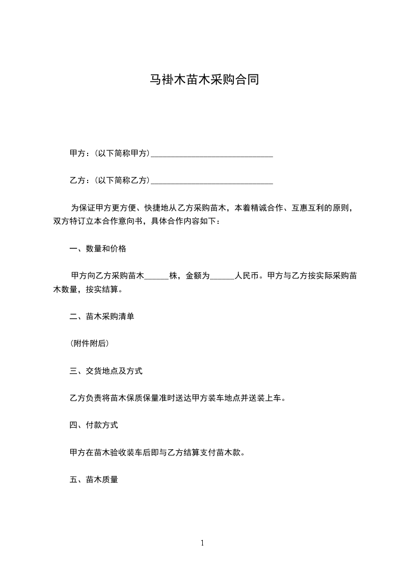 甲方向乙方采购苗木______株,金额为______人民币。甲方与乙方按实际采购苗木数量,按实结算。