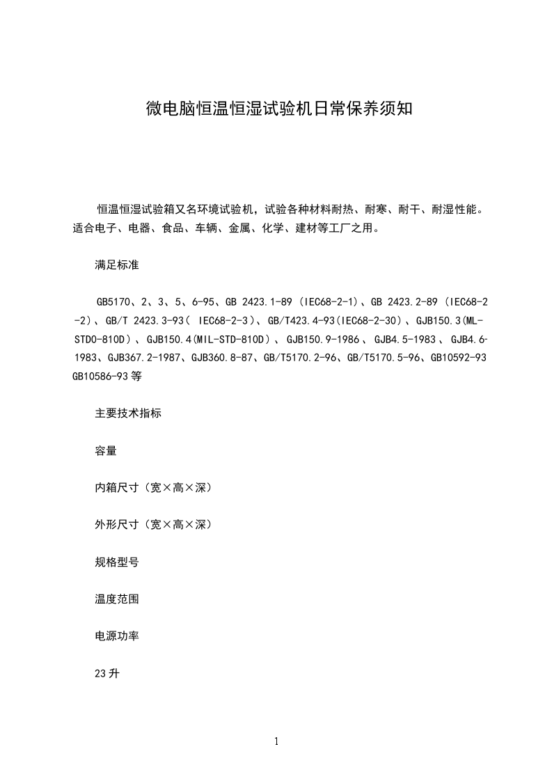 GB5170、2、3、5、6-95、GB 2423.1-89 (IEC68-2-1)、GB 2423.2-89 (IEC68-2-2)、GB/T 2423.3-93(IEC68-2-3)、GB/T423.4-93(IEC68-2-30)、GJB150.3(ML-STD0-810D)、GJB150.4(MIL-STD-810D)、GJB150.9-1986、GJB4.5-1983、GJB4.6-1983、GJB367.2-1987、GJB360.8-87、GB/T5170.2-96、GB/T5170.5-96、GB10592-93、GB10586-93等