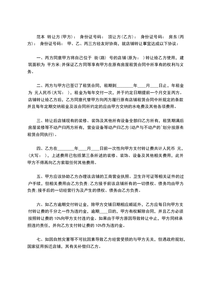 范本 转让方(甲方): 身份证号码: 顶让方(乙方): 身份证号码: 房东(丙方): 身份证号码: 甲、乙、丙三方经友好协商,就店铺转让事宜达成以下协议:
