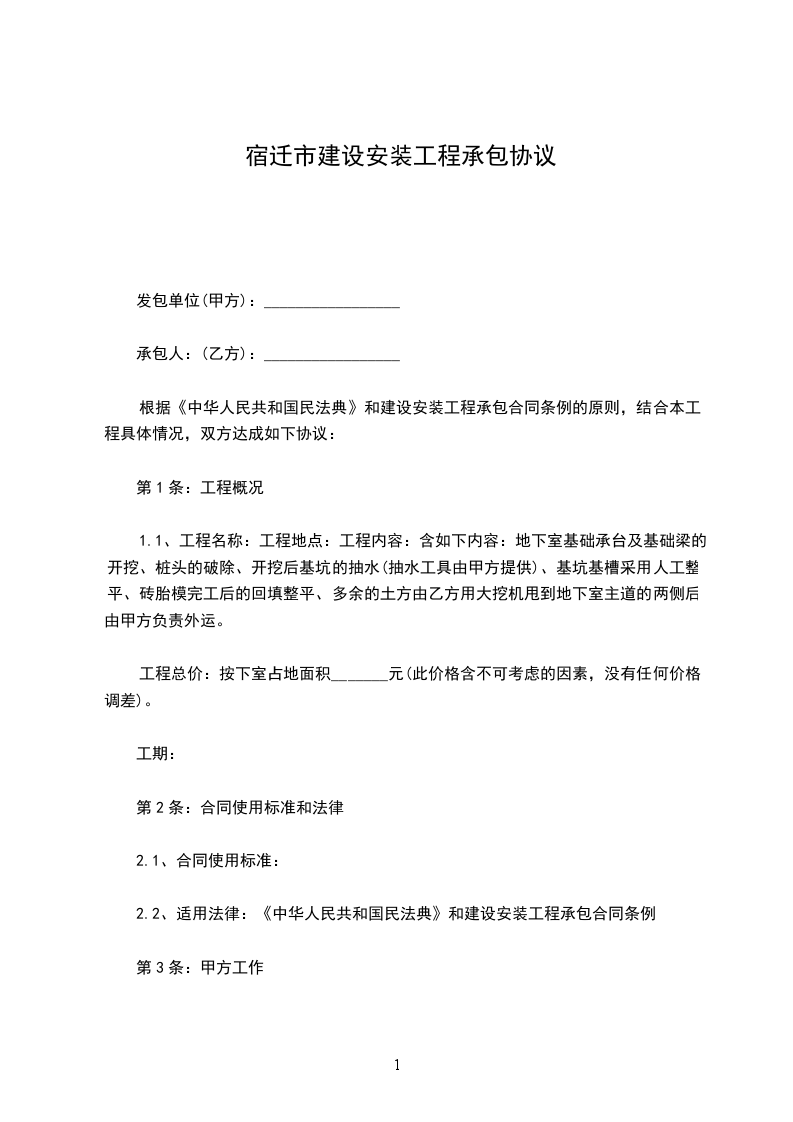 根据《中华人民共和国民法典》和建设安装工程承包合同条例的原则,结合本工程具体情况,双方达成如下协议: