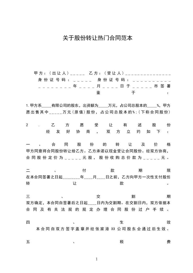 1.甲方系_____有限公司的股东,出资额为_____万元,占公司总股本的_____%,甲方愿出售其中_____万元(原值)股份,占公司总股本的_____%;(下称合同股份)