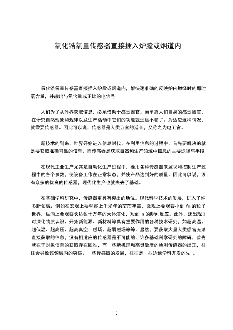 氧化锆探头的安装首先要考虑安装点的温度。一般来说,烟气温度较低,检测元件锆管使用寿命长,但探头的本底、内阻较大;烟气温度高,探头寿命短,但内阻小,动态响应快。一般中小型锅炉安装点选在锅炉省煤器前、过热器后较合适,安装点烟气流动性较好,切忌安装在炉内侧、死角涡流缩口处,内侧和死角点容易使响应滞缓,气涡流处氧含量波动大,缩口处易灰堵及冲刷厉害,而且安装点不能有漏气,否则烟道内负压将空气吸入烟道,造成氧量测量偏高,不能如实反映烟道内氧含量。另外,可根据锅炉吨位的大小或炉墙的厚度来选择探头的长度,一般有L=400mm、600mm、800mm,1000mm,1200mm,氧化锆探头的长度可根据用户需要定制。