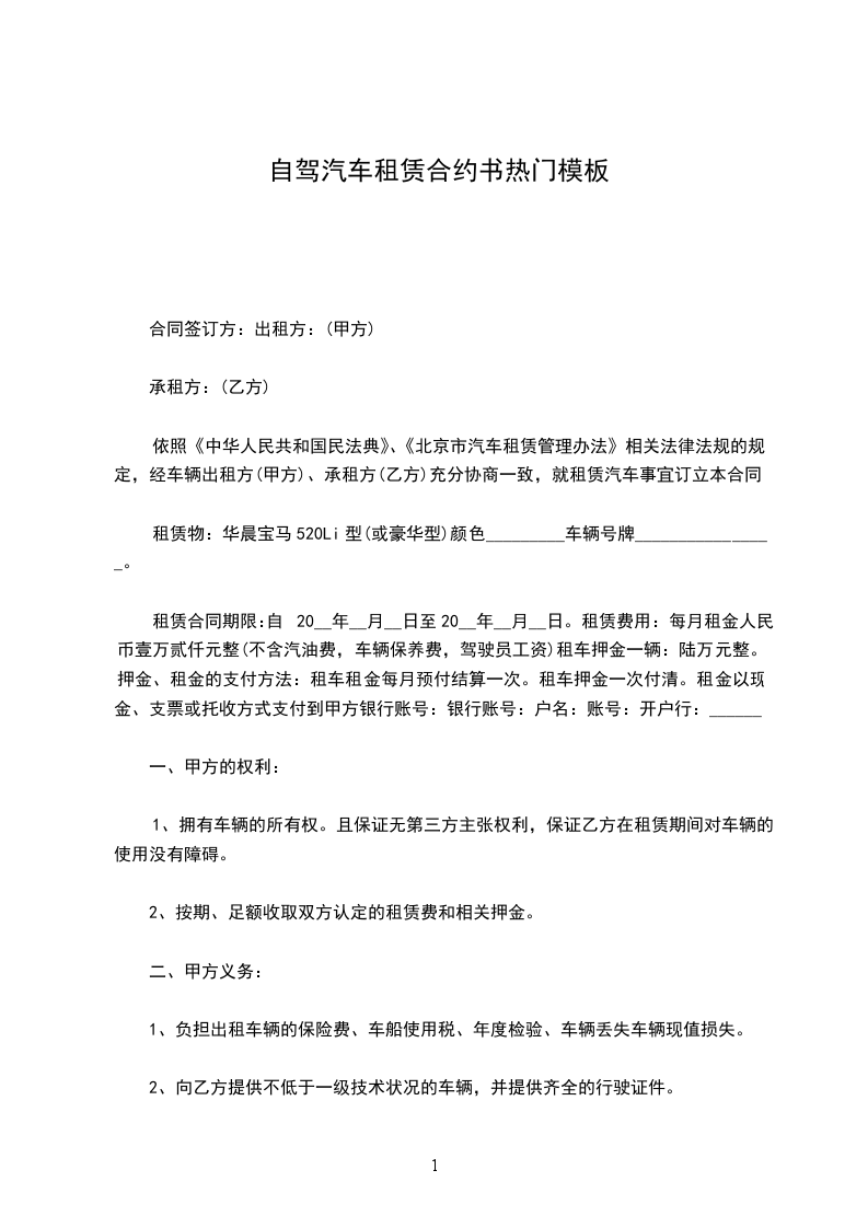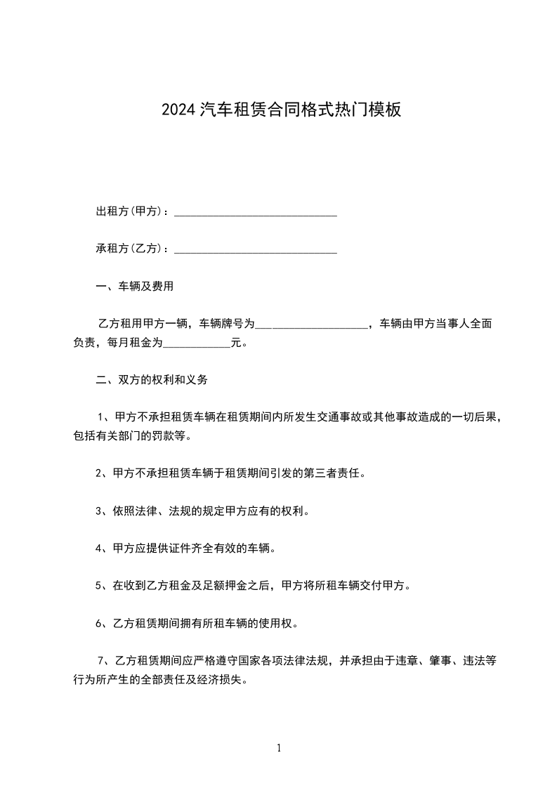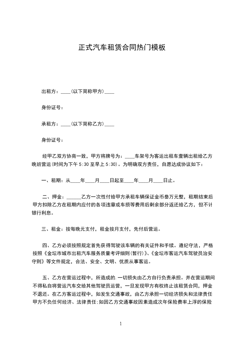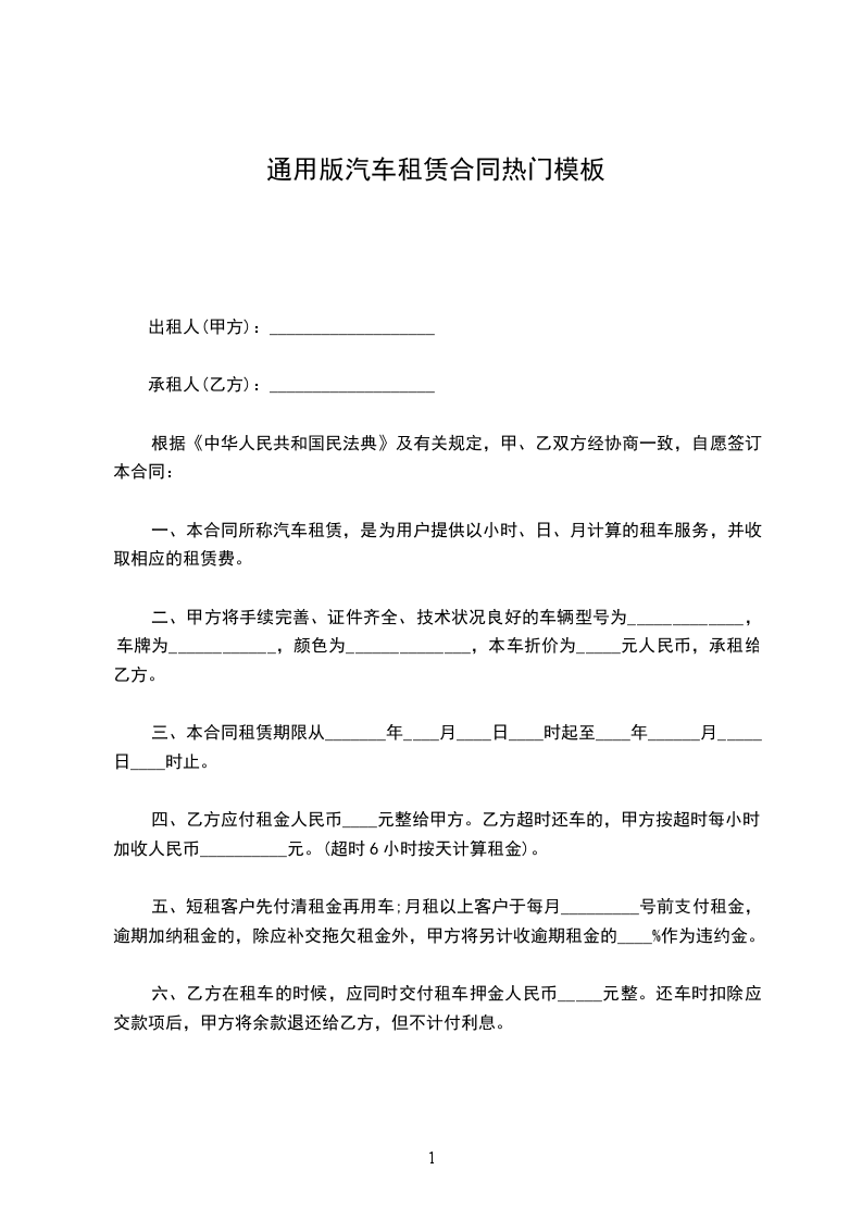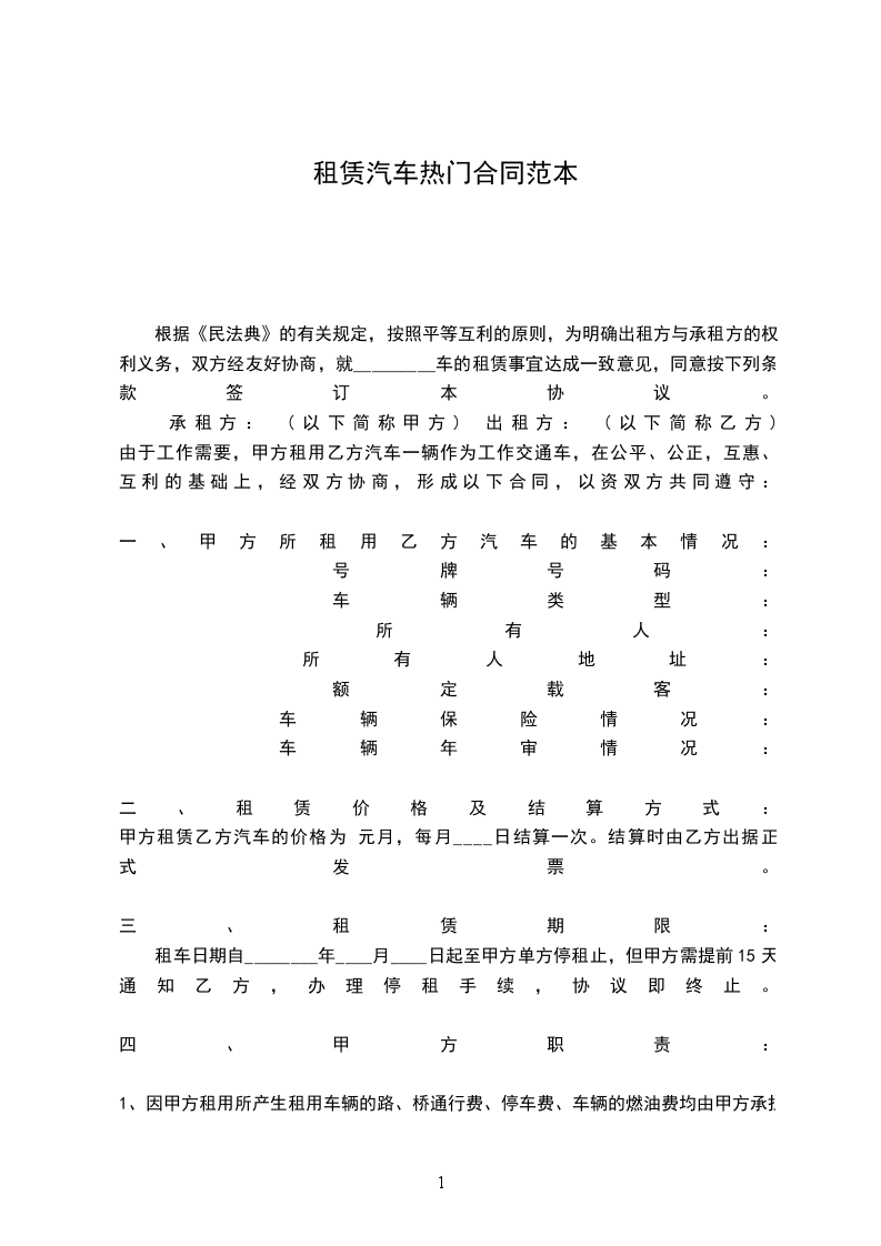 根据《民法典》的有关规定,按照平等互利的原则,为明确出租方与承租方的权利义务,双方经友好协商,就_________车的租赁事宜达成一致意见,同意按下列条款签订本协议。