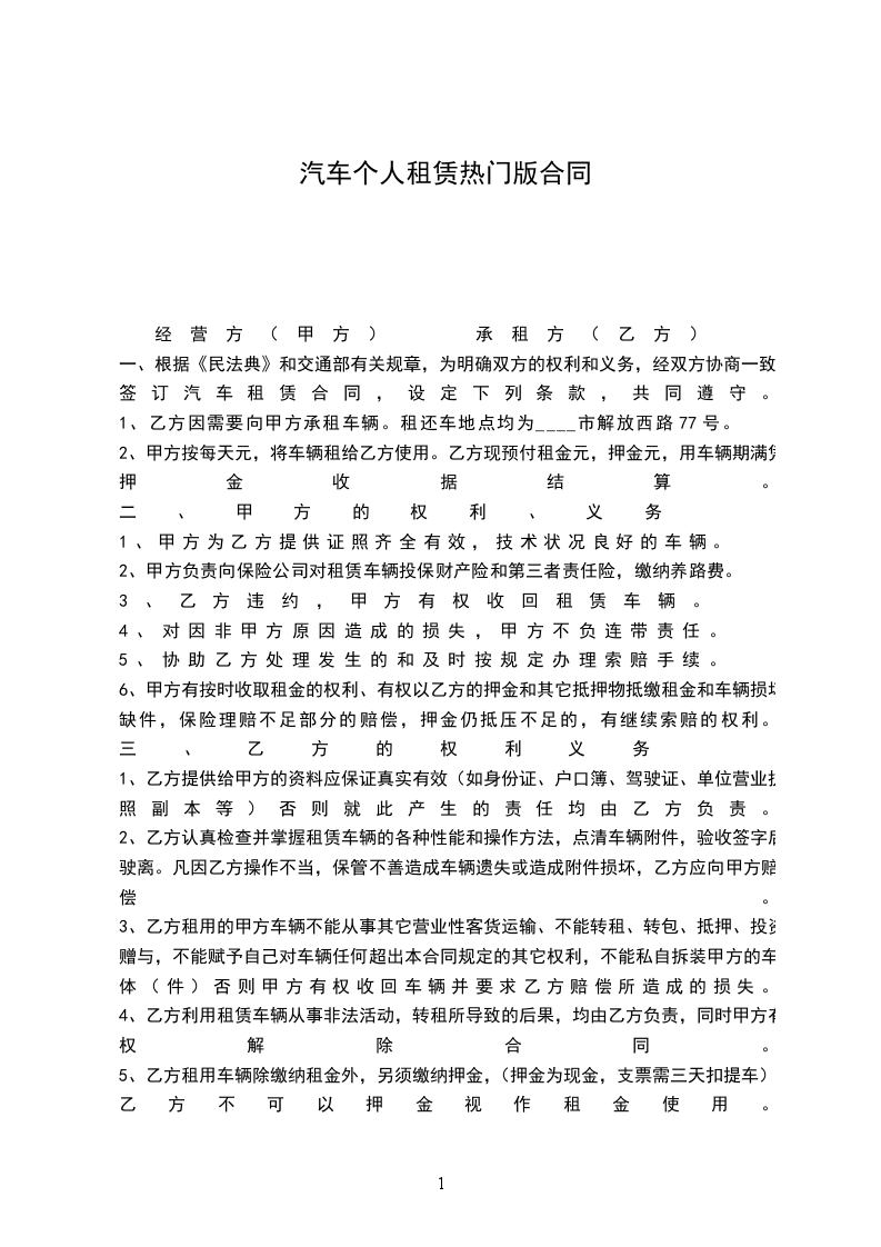 1、乙方因需要向甲方承租车辆。租还车地点均为____市解放西路77号。
