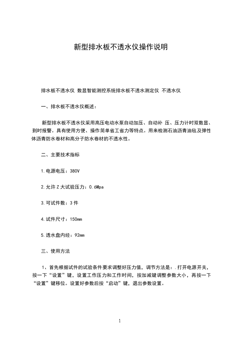 新型排水板不透水仪采用高压电动水泵自动加压、自动补 压、压力计时双数显、到时报警。具有使用方便、操作简单省工省力等特点。用来检测石油沥青油毡及弹性体沥青防水卷材和高分子防水卷材的不透水性。