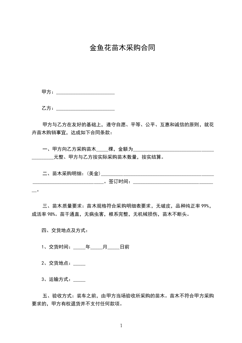 一、甲方向乙方采购苗木_____棵,金额为__________________________________________元整、甲方与乙方按实际采购苗木数量,按实结算。