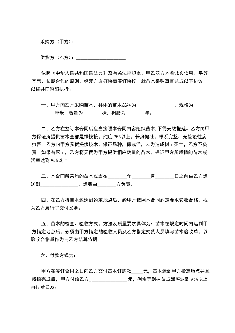 依照《中华人民共和国民法典》及有关法律规定,甲乙双方本着诚实信用、平等互惠、长期合作的原则,经双方友好协商签订协议。就苗木采购事宜达成以下协议,以资共同遵照执行: