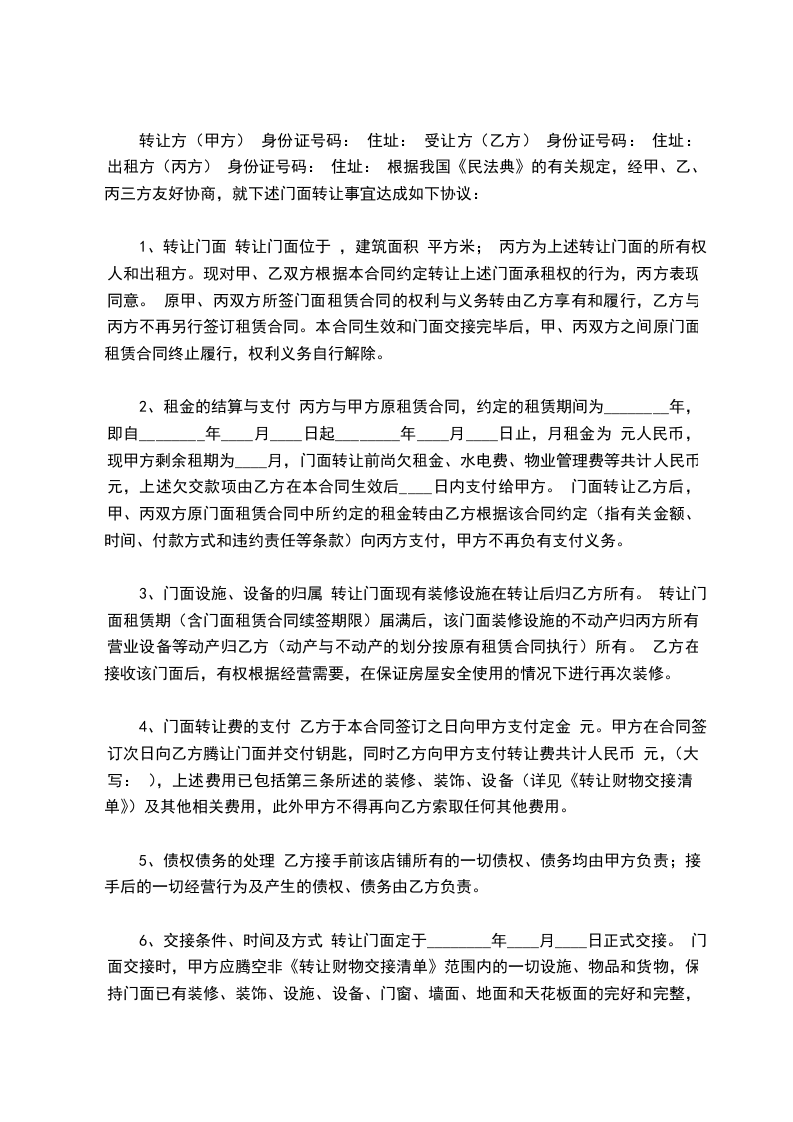 转让方(甲方) 身份证号码: 住址: 受让方(乙方) 身份证号码: 住址: 出租方(丙方) 身份证号码: 住址: 根据我国《民法典》的有关规定,经甲、乙、丙三方友好协商,就下述门面转让事宜达成如下协议: