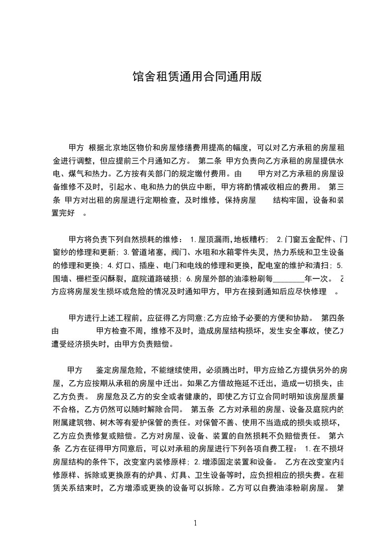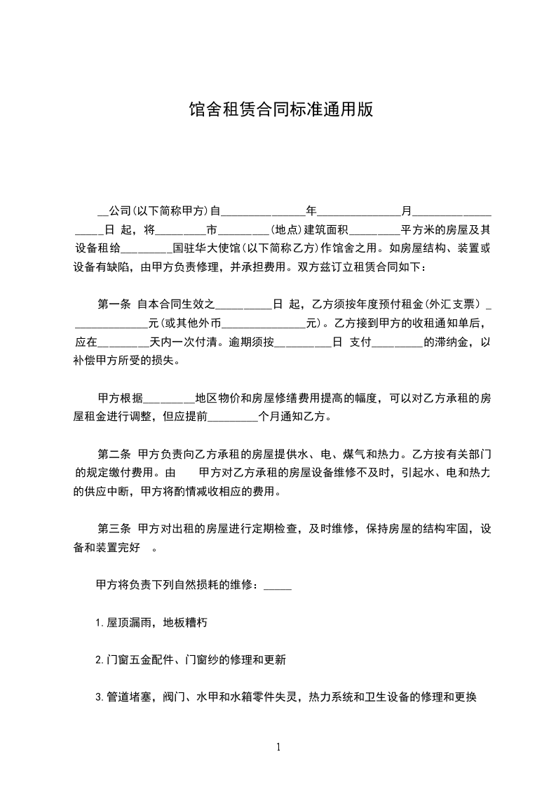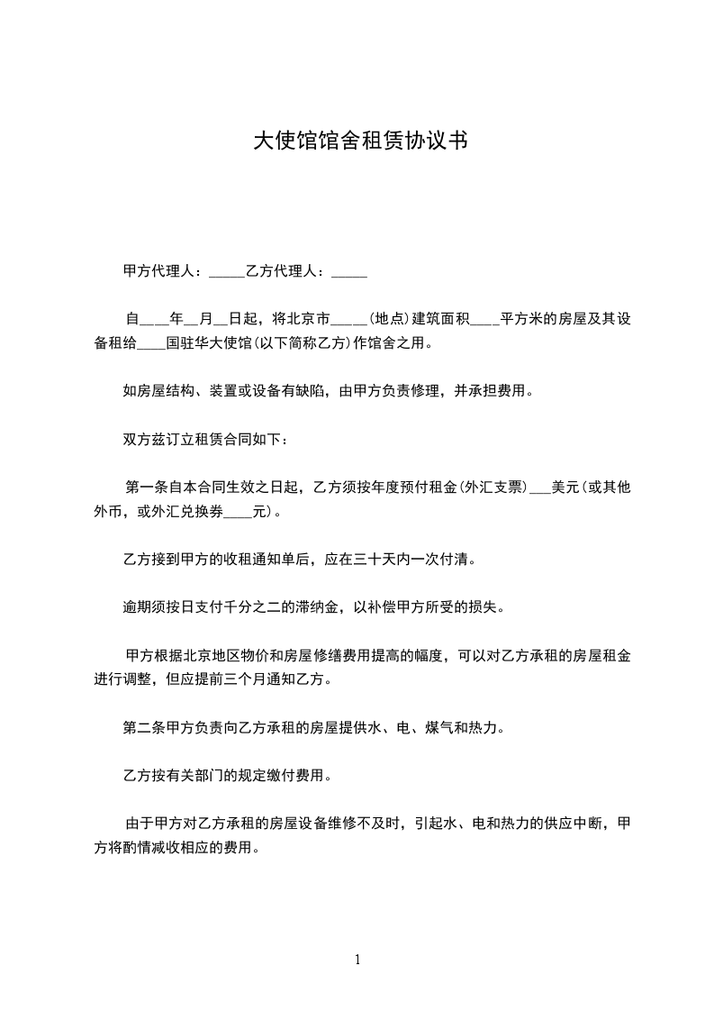 馆舍租赁合同范本 房屋租赁合同是不动产租赁合同。以租赁物的种类为标准,租赁合同可以分为动产租赁合同和不动产租赁合同。房屋租赁合同是以房屋为标的物的合同,属于不动产租赁合同。下面是关于馆舍租赁合同范本,欢迎阅读! 北京外交人员房屋服务公司(以下简称甲方)自________年____月____日起,将____市_____(地点)建筑面积____平方米的房屋及其设备租给____国驻华大使馆(以下简称乙方)作馆舍之用。如房屋结构、装置或设备有缺陷,由甲方负责修理,并承担费用。 双方兹订立租赁合同如下: