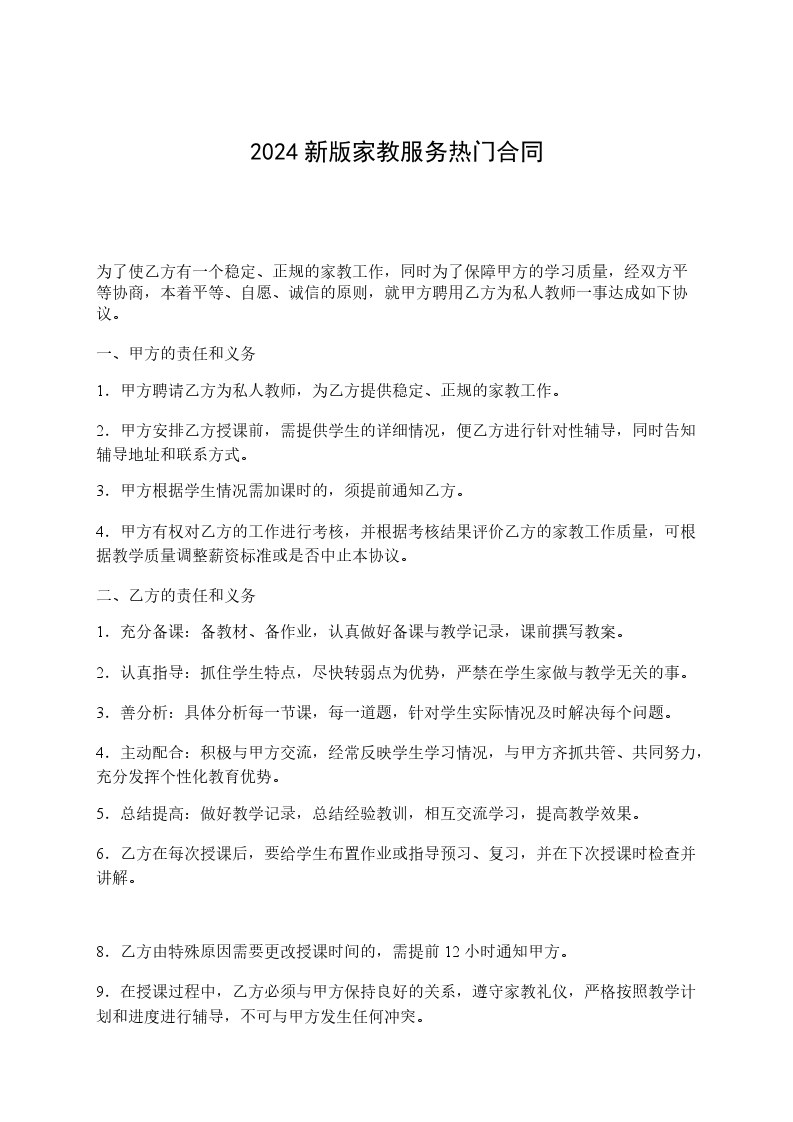 1. 甲方聘请乙方为私人教师,为乙方提供稳定、正规的家教工作。