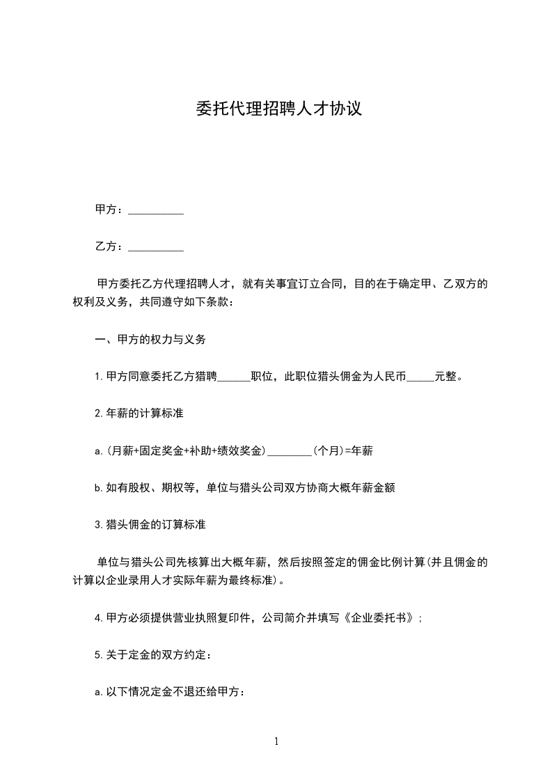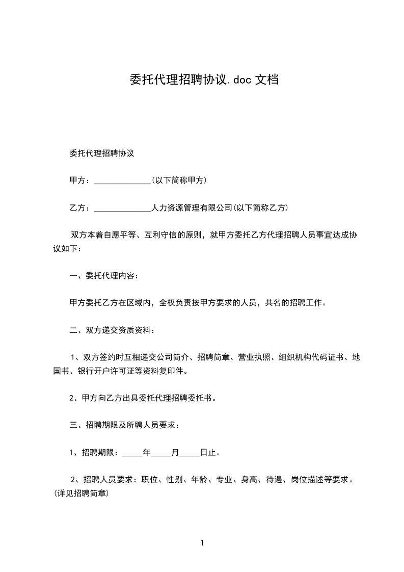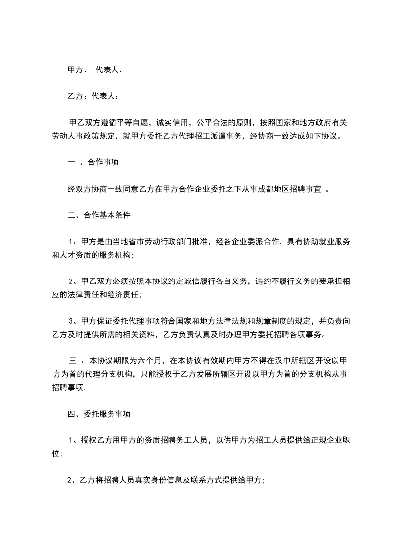 甲乙双方经平等友好协商,以执行国家相关法律、法规为前提,在合理、规范、共同发展的前提下,就甲方委托乙方提供代理招聘一事,达成合作协议如下: