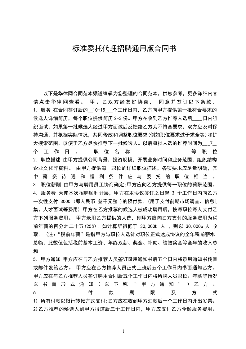 2、付费标准:甲方向乙方支付委托代理招聘费用的标准为人民币____元∕标准人次。