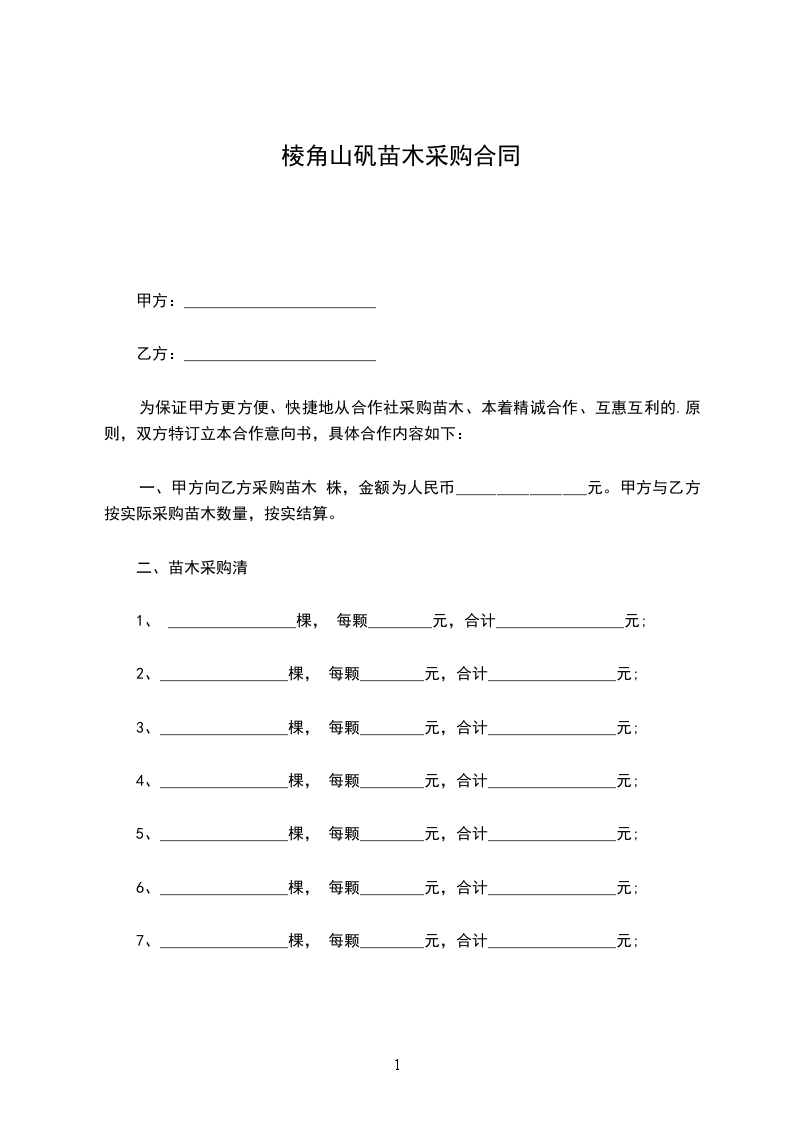 一、甲方向乙方采购苗木 株,金额为人民币________________元。甲方与乙方按实际采购苗木数量,按实结算。