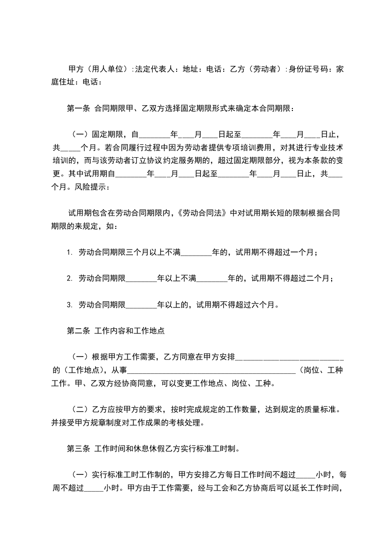 (一)固定期限,自________年____月____日起至________年____月____日止,共_____个月。若合同履行过程中因为劳动者提供专项培训费用,对其进行专业技术培训的,而与该劳动者订立协议约定服务期的,超过固定期限部分,视为本条款的变更。其中试用期自________年____月____日起至________年____月____日止,共____个月。风险提示: