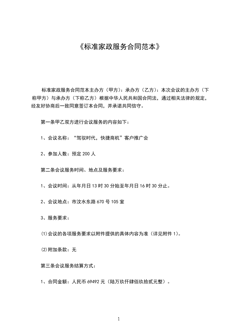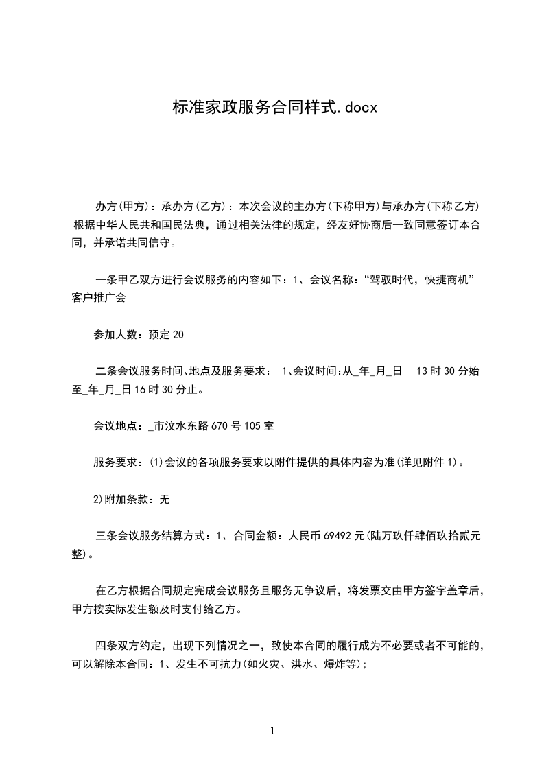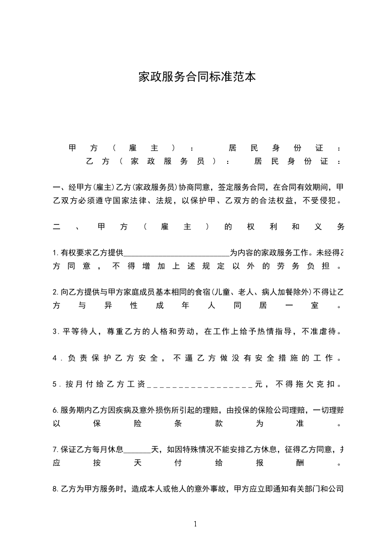 一、经甲方(雇主)乙方(家政服务员)协商同意,签定服务合同,在合同有效期间,甲、乙双方必须遵守国家法律、法规,以保护甲、乙双方的合法权益,不受侵犯。