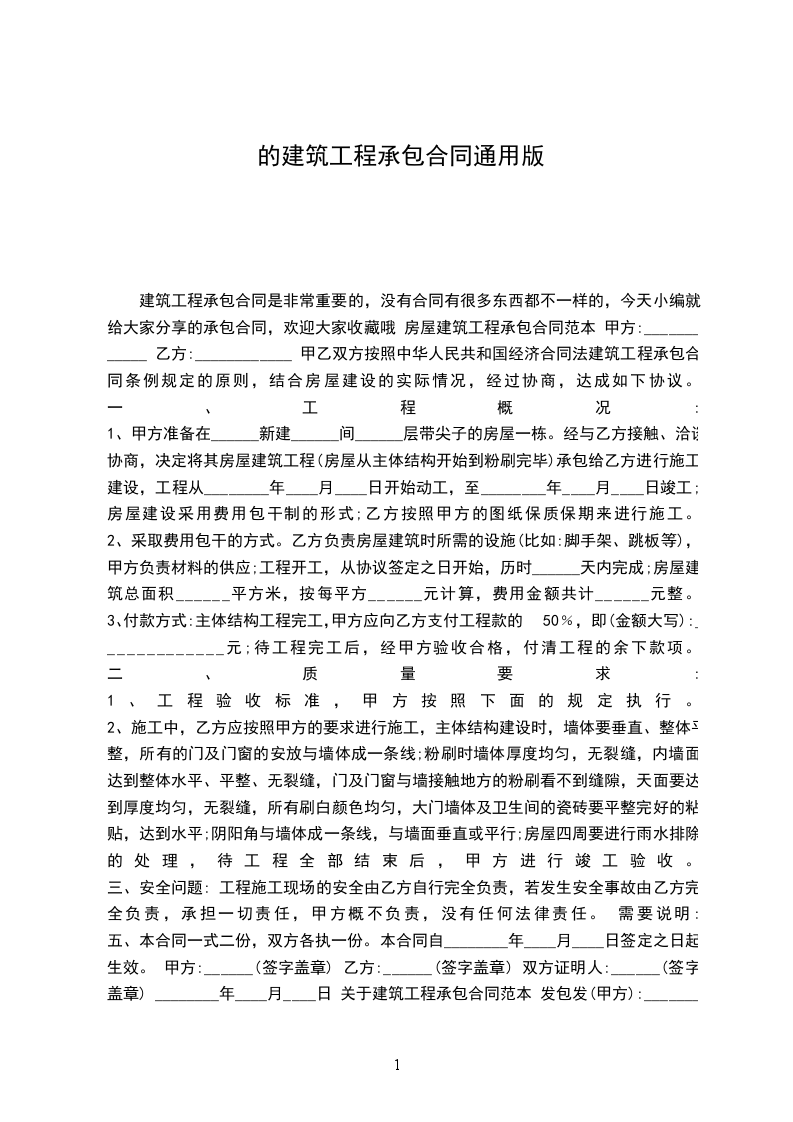 五、本合同一式二份,双方各执一份。本合同自________年____月____日签定之日起生效。 甲方:______(签字盖章) 乙方:______(签字盖章) 双方证明人:______(签字盖章) ________年____月____日 关于建筑工程承包合同范本 发包发(甲方):___________ 承包方(乙方):___________ 经双方协商同意甲方将_____________________________工程承包给乙方,为了明确甲乙双方责任和义务,特签订本合同: