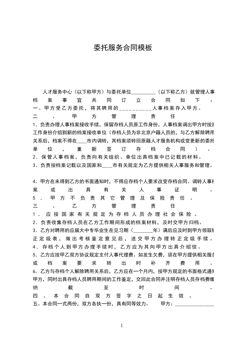 人才服务中心(以下称甲方)与委托单位__________(以下称乙方)就管理人事档案事宜共同订立合同如下: