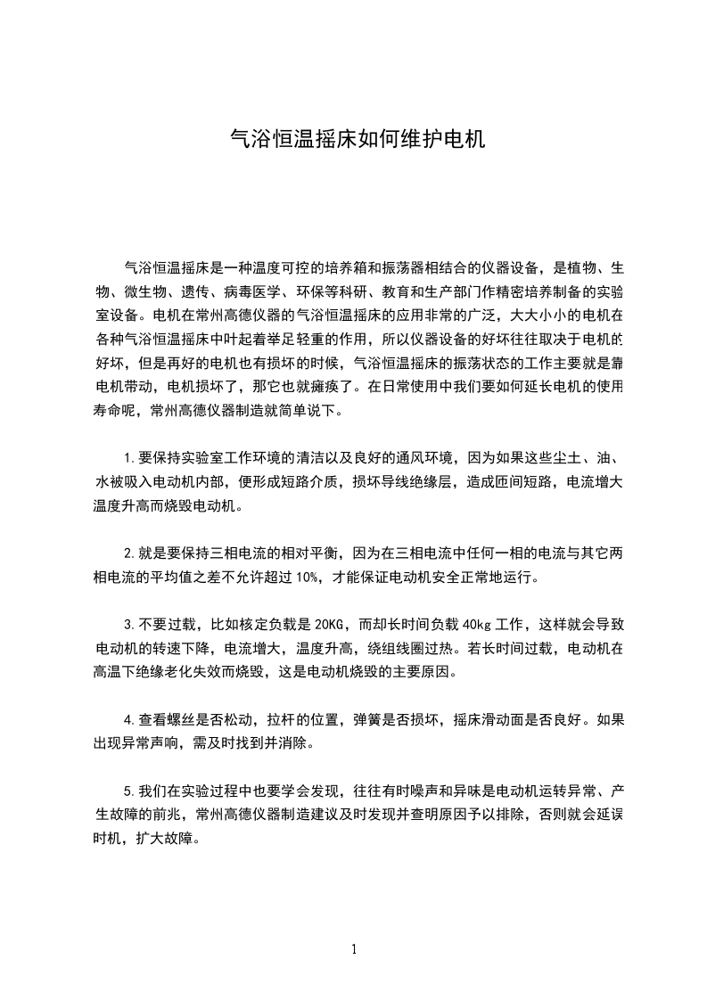 气浴恒温摇床是一种温度可控的培养箱和振荡器相结合的仪器设备,是植物、生物、微生物、遗传、病毒医学、环保等科研、教育和生产部门作精密培养制备的实验室设备。电机在常州高德仪器的气浴恒温摇床的应用非常的广泛,大大小小的电机在各种气浴恒温摇床中叶起着举足轻重的作用,所以仪器设备的好坏往往取决于电机的好坏,但是再好的电机也有损坏的时候,气浴恒温摇床的振荡状态的工作主要就是靠电机带动,电机损坏了,那它也就瘫痪了。在日常使用中我们要如何延长电机的使用寿命呢,常州高德仪器制造就简单说下。