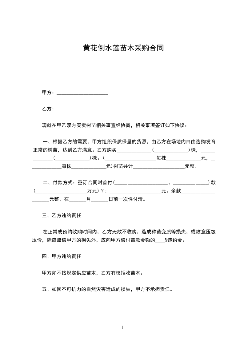 一、根据乙方的需要,甲方组织保质保量的货源,由乙方在场地内自由选购发育正常的树苗,达到乙方满意。乙方购买______________(______________)株,______________(______________)株。(_____________________每株______________元,______________每株______________元)树苗共计_____________________元整。