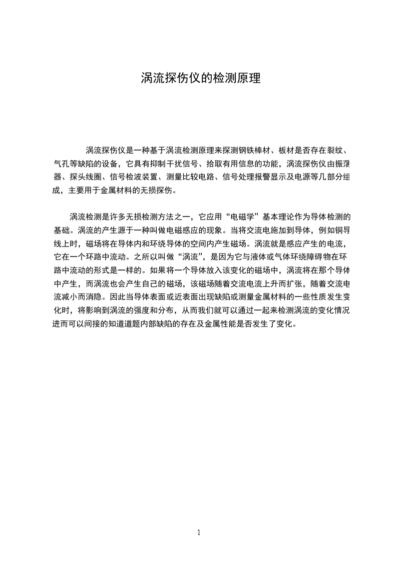 涡流检测是许多无损检测方法之一,它应用“电磁学”基本理论作为导体检测的基础。涡流的产生源于一种叫做电磁感应的现象。当将交流电施加到导体,例如铜导线上时,磁场将在导体内和环绕导体的空间内产生磁场。涡流就是感应产生的电流,它在一个环路中流动。之所以叫做“涡流”,是因为它与液体或气体环绕障碍物在环路中流动的形式是一样的。如果将一个导体放入该变化的磁场中,涡流将在那个导体中产生,而涡流也会产生自己的磁场,该磁场随着交流电流上升而扩张,随着交流电流减小而消隐。因此当导体表面或近表面出现缺陷或测量金属材料的一些性质发生变化时,将影响到涡流的强度和分布,从而我们就可以通过一起来检测涡流的变化情况,进而可以间接的知道道题内部缺陷的存在及金属性能是否发生了变化。