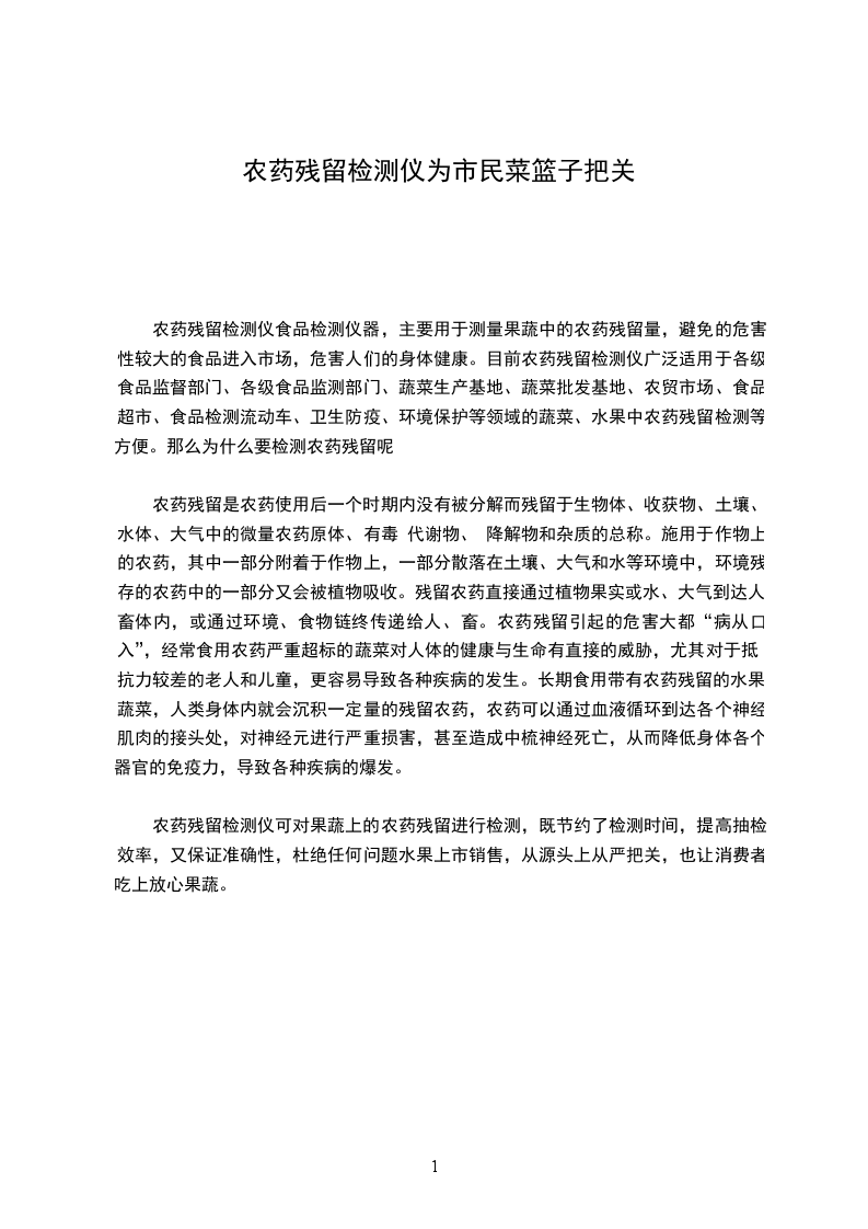农药残留检测仪食品检测仪器,主要用于测量果蔬中的农药残留量,避免的危害性较大的食品进入市场,危害人们的身体健康。目前农药残留检测仪广泛适用于各级食品监督部门、各级食品监测部门、蔬菜生产基地、蔬菜批发基地、农贸市场、食品超市、食品检测流动车、卫生防疫、环境保护等领域的蔬菜、水果中农药残留检测等方便。那么为什么要检测农药残留呢