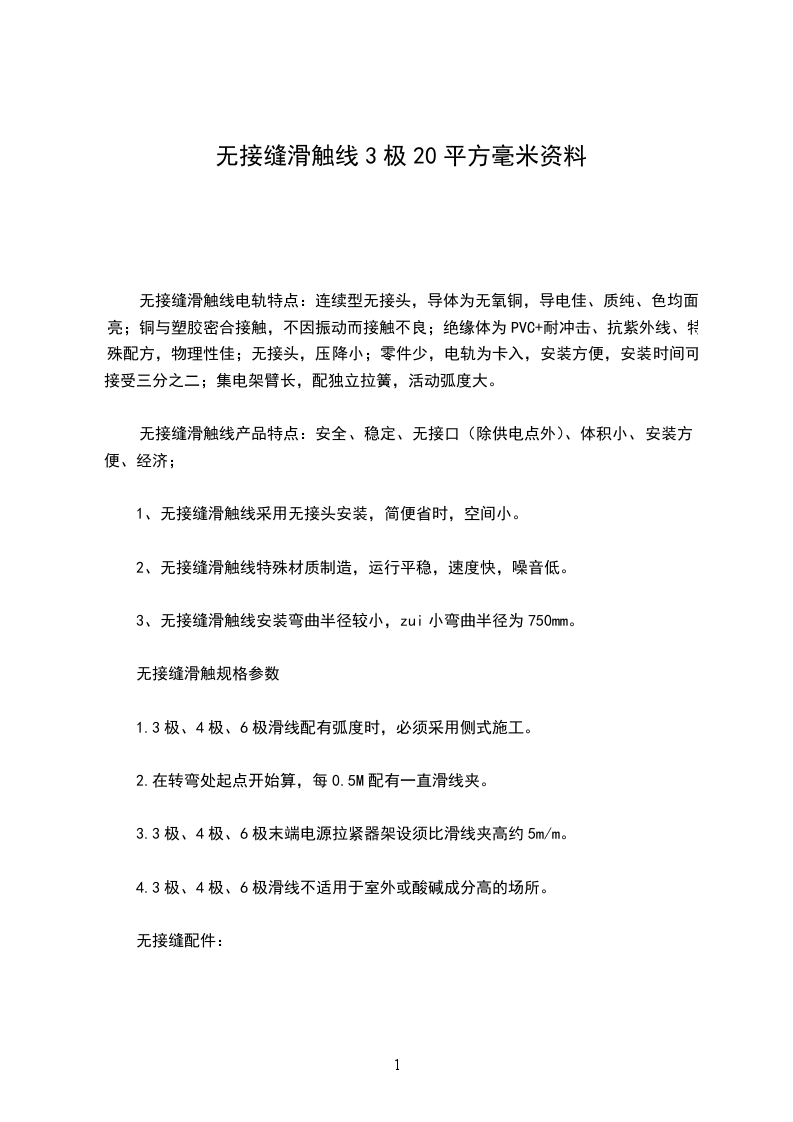 无接缝滑触线电轨特点:连续型无接头,导体为无氧铜,导电佳、质纯、色均面亮;铜与塑胶密合接触,不因振动而接触不良;绝缘体为PVC+耐冲击、抗紫外线、特殊配方,物理性佳;无接头,压降小;零件少,电轨为卡入,安装方便,安装时间可接受三分之二;集电架臂长,配独立拉簧,活动弧度大。