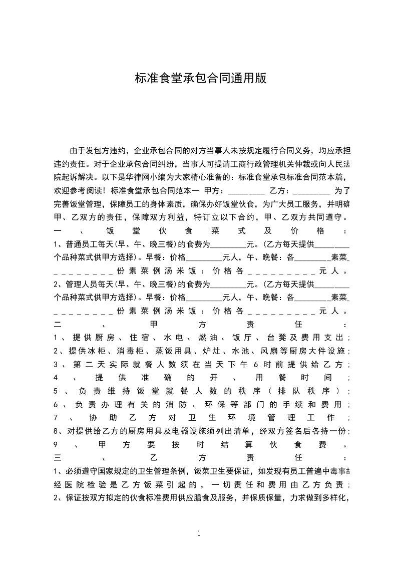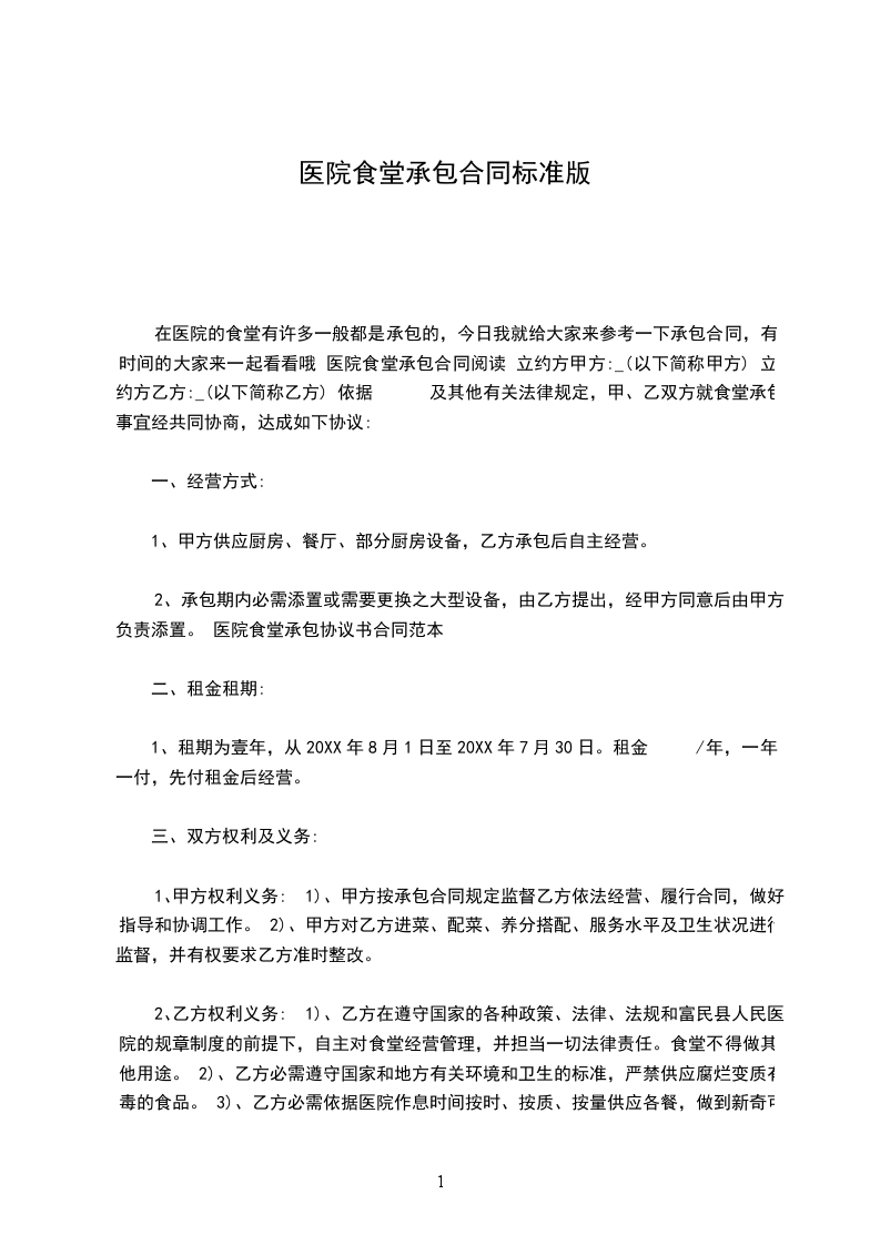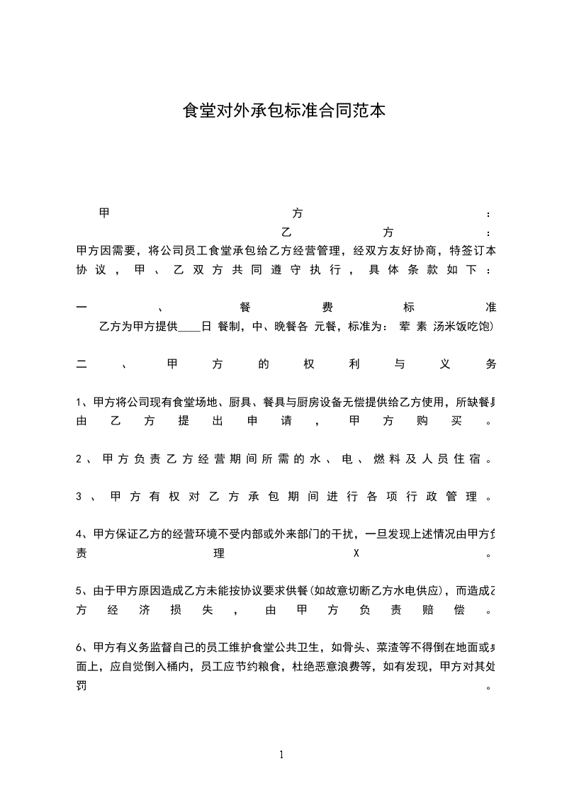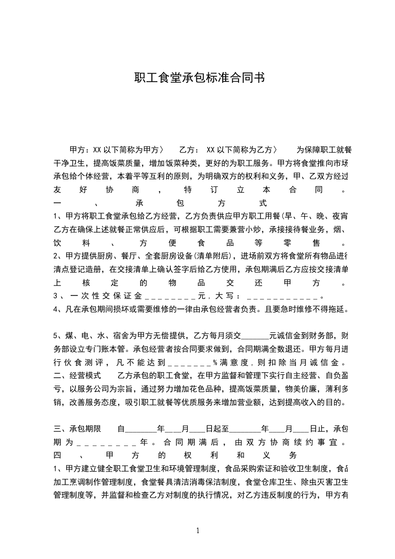 一、承包范围和期限。 甲方同意将学校食堂发包给乙方经营。承包期限为________年即:________年____月____日至________年1____月____日。