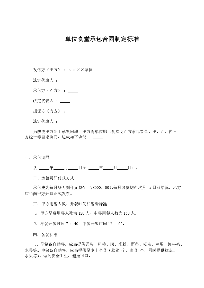 七、本合同经双方签字盖X即可生效,合同一式两份,甲、乙双方各执一份。 甲方(盖X):_________乙方(盖X):_________ 甲方代表人(签字):_________ 乙方代表人(签字):_________ ________年____月____日________年____月____日 标准食堂承包合同范本二 发包方:学院(甲方) 承包方: (乙方) 根据教育局《》文件精神,为了进一步办好食堂,改善师生生活,为教育教学工作服务。学院(以下简称甲方)同意将食堂发包给 (以下简称乙方)承包经营。为了明确甲乙双方的责任和权利关系,经双方协商特定如下条款,共同遵守执行。