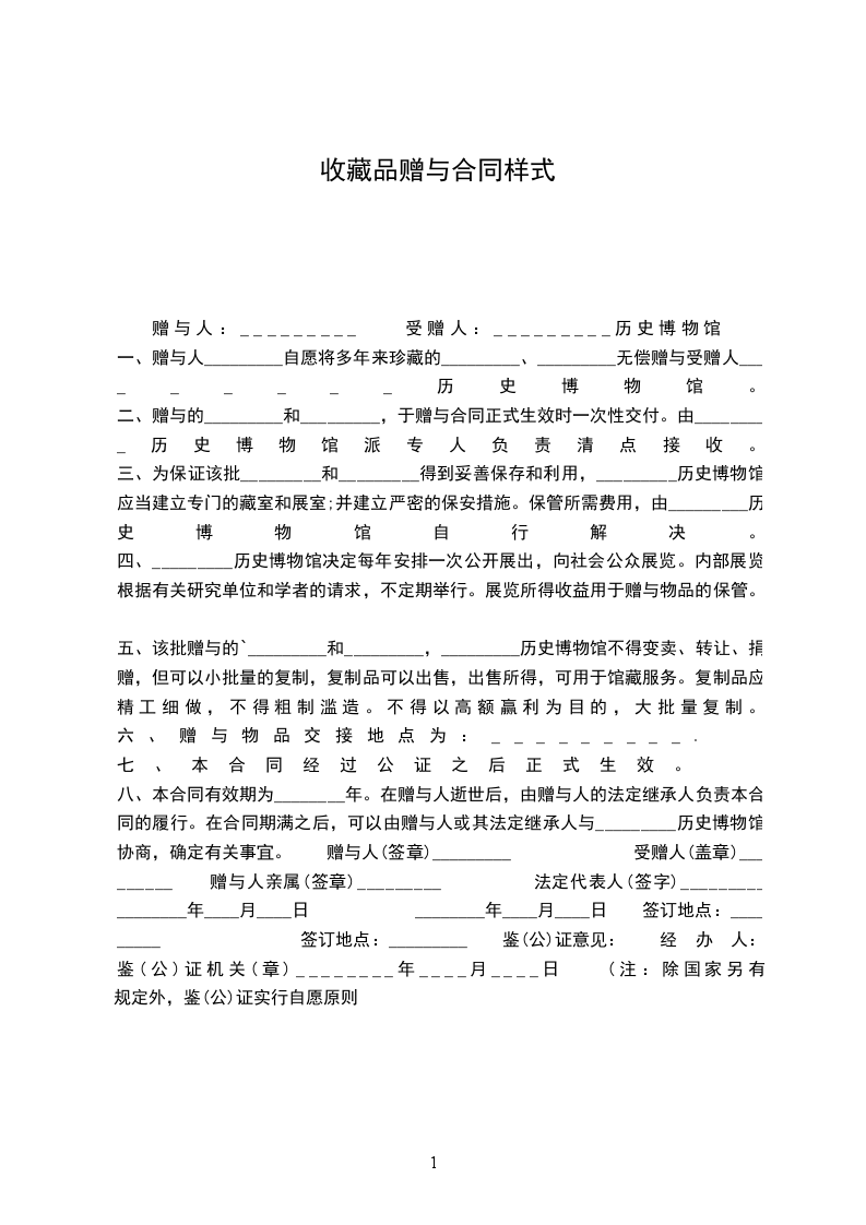 八、本合同有效期为________年。在赠与人逝世后,由赠与人的法定继承人负责本合同的履行。在合同期满之后,可以由赠与人或其法定继承人与_________历史博物馆协商,确定有关事宜。 赠与人(签章)_________ 受赠人(盖章)_________ 赠与人亲属(签章)_________ 法定代表人(签字)_________ ________年____月____日 ________年____月____日 签订地点:_________ 签订地点:_________ 鉴(公)证意见: 经 办 人: 鉴(公)证机关(章)________年____月____日 (注:除国家另有规定外,鉴(公)证实行自愿原则
