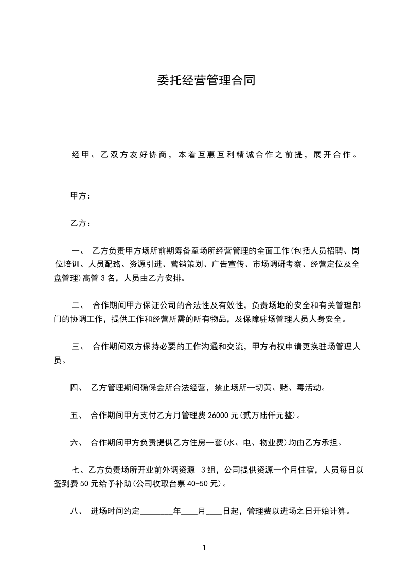 四、 乙方管理期间确保会所合法经营,禁止场所一切黄、赌、毒活动。